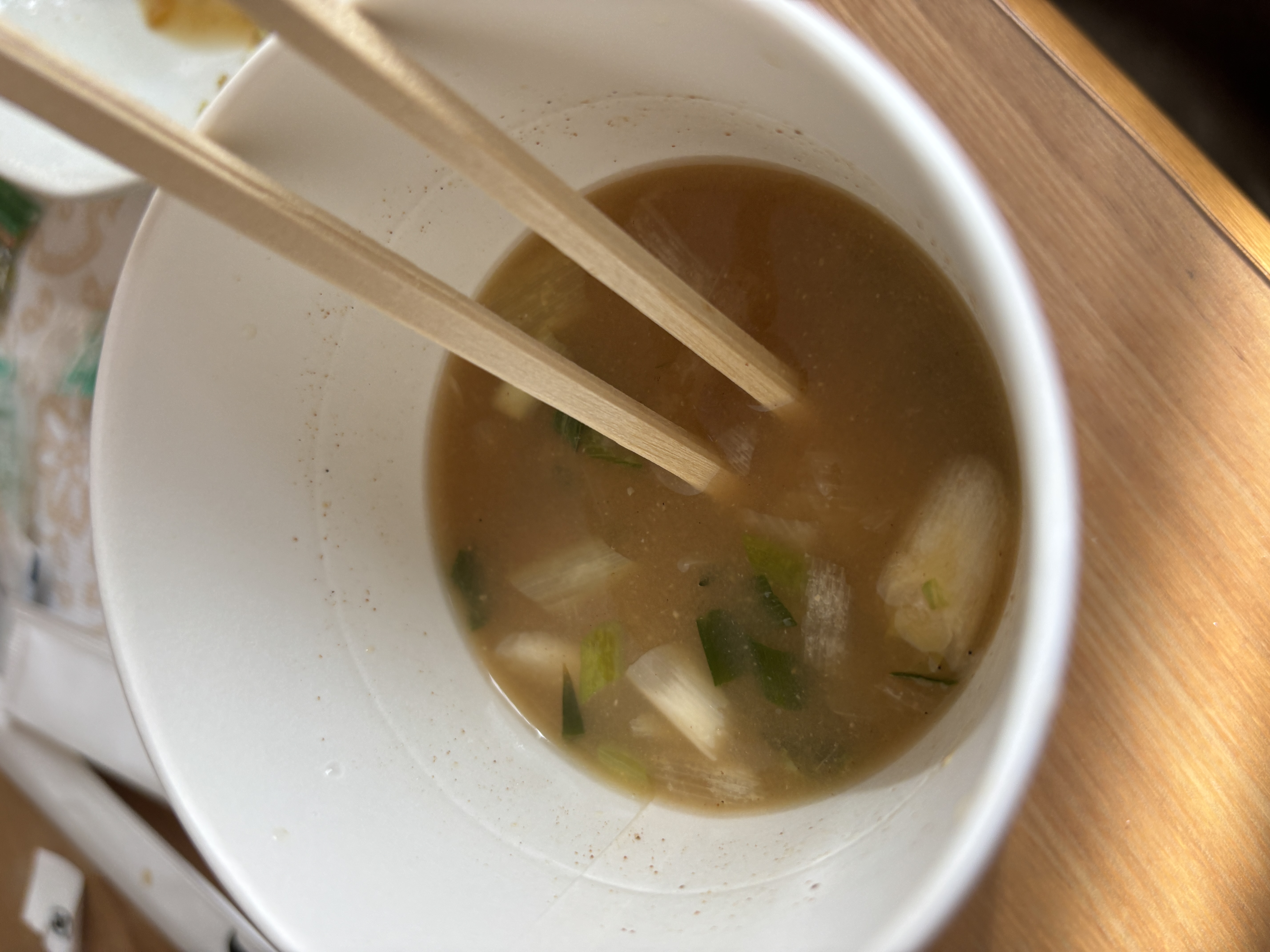 一言:寿司はワサビを多めに付けたらすごくおいしかったです。味噌汁みたいなやつは落ち着いた感じで美味しかったです。